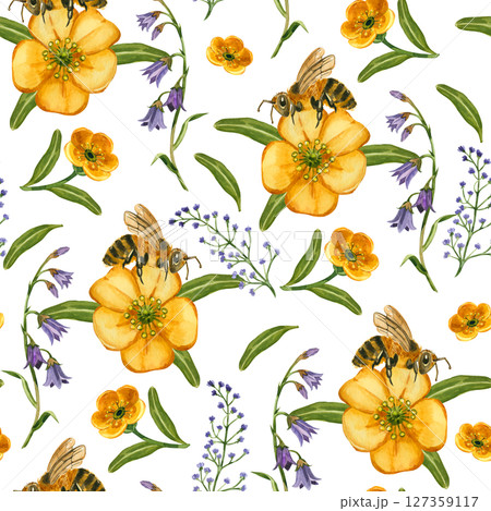 Seamless watercolor pattern. Meadow flowers and grasses, yellow buttercups, purple bluebells, bee, green leaves. All objects are hand-painted in watercolor. For printing on fabric, paper, bed linen.