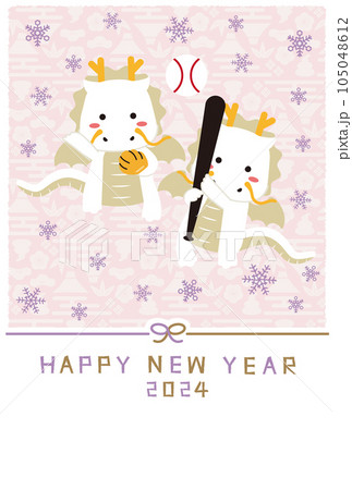 2024年 年賀状 二刀流→2頭龍 白竜 ピンク金紫 雪の結晶 縦