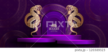 Chinese New Year. Purple greeting card with round frame with snake isolated.