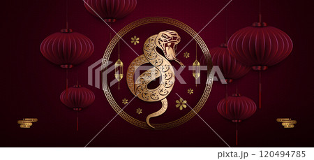 Chinese New Year 2025. Burgundy greeting card, round frame with snake isolated