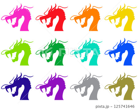ドラゴンの頭部シルエット 12色カラフルアイコンセット
