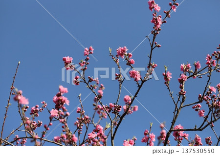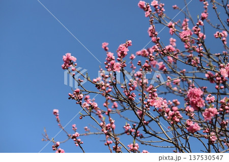 早春の公園に咲くピンク色の八重咲きの花桃(矢口桃)の花