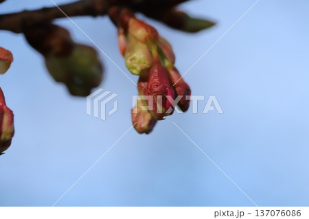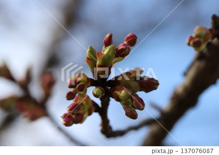 冬の公園に咲くカワヅザクラの赤い蕾の様子