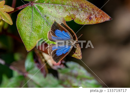 生き物 昆虫 ムラサキツバメ、メスです。前翅中央に美しい瑠璃色。天敵を遠ざける効果がある?