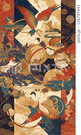 雲の流れと羽ばたく鳥の動きが調和した、手描き風和風イラスト素材|着物・和雑貨・屏風・壁紙デザイン
