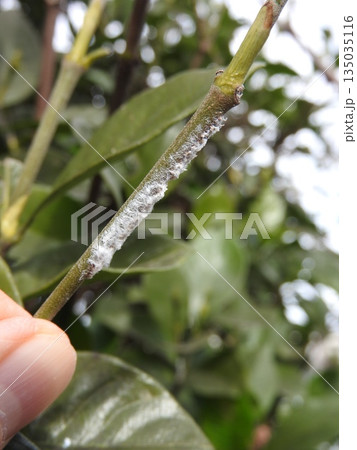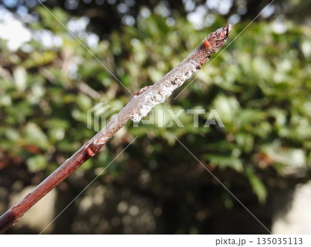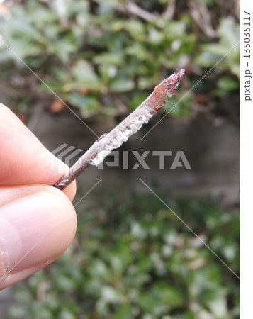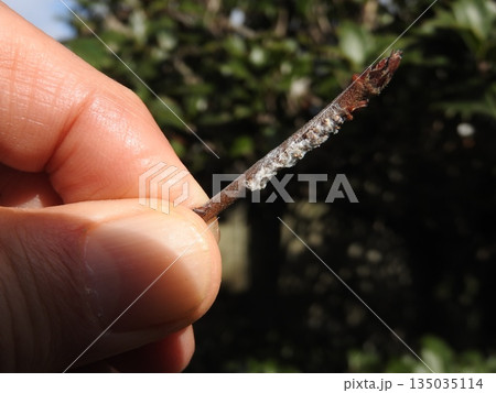 2017年に発見されて生息範囲拡大中の外来種「チュウゴクアミガサハゴロモ」:枝に産み付けられた卵の痕