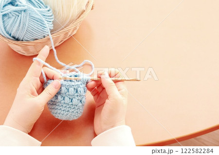 かぎ針編みで水色の毛糸を編む両手
