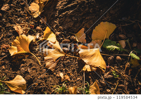 秋の大地に散らばる銀杏の葉