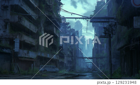 霧に包まれる荒廃した街、アニメ風