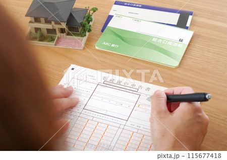 通帳を開いてメモに書き込む高齢女性の後姿通帳を開いて指で指し、メモ書きする高齢女性の手