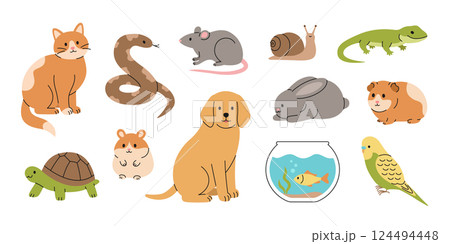 Cute pet set: cat, dog, rabbit, guinea pig, hamster, rat, parrot, fish, snake, turtle, lizard and snail. Cartoon domestic animals collection. Vector flat illustration isolated on white background