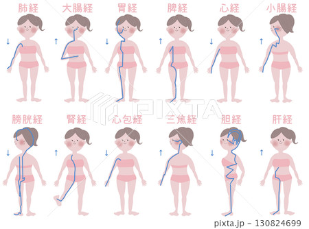 奇経八脈の流注を若い女性の身体で表したイラストセット