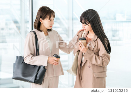 反省・後悔して悩みを先輩・上司に相談するビジネスウーマンと慰める女性