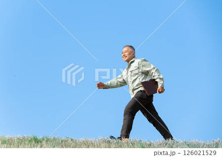 ガッツポーズで飛び跳ねるビジネスマン(シニア・茶色スーツ)