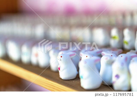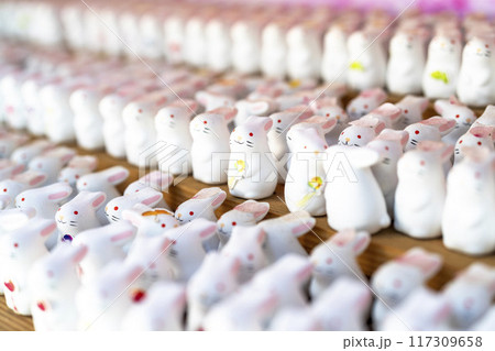 初夏の熊野神社(熊野大社)に並ぶうさぎの置物たち_山形県南陽市