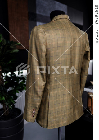 Single breasted jacket suit technical fashion illustration with long sleeves, notched lapel collar, flap welt pockets.
