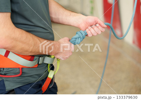 Man tying safety knot for indoor climbing