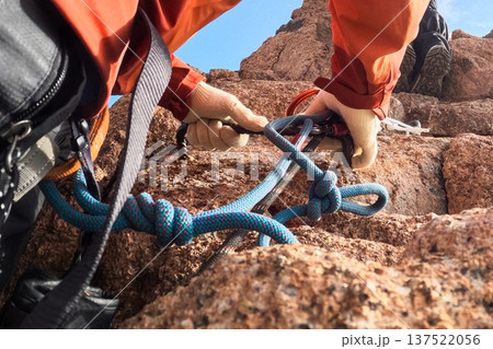 Close-up of mountain climber hands in gloves securing a blue safety rope with knots on a steep rock face during an ascent.