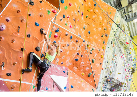 Female climber scaling orange climbing wall at gym wearing lime top and harness, copy space