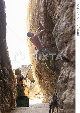 Young man rock climbing while woman belaying with rock face