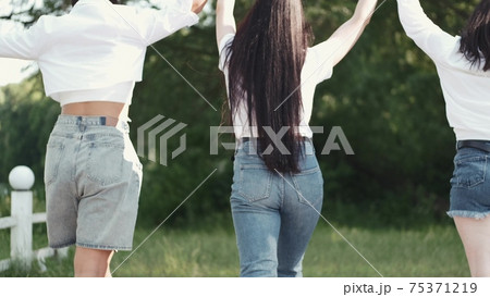Three pretty brunette girlfriends going on the grass holding hands