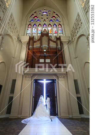 結婚式場で新たな人生の門出の扉を開く新郎新婦 扉が描く光の十字架 高品質ウェディング広告素材