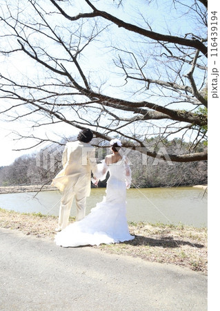 ウエディングドレス姿の新婦様とタキシード姿の新郎様フォトウエディング後ろ姿、湖畔でロケーション撮影