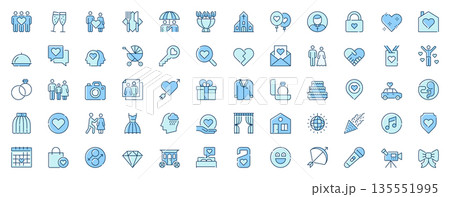 Family and wedding web icons set in line design. Duotone pictogram pack of love, couple, bouquet, ring, balloon, heart, cake, padlock, baby stroller, more outline stroke signs. Vector illustration.