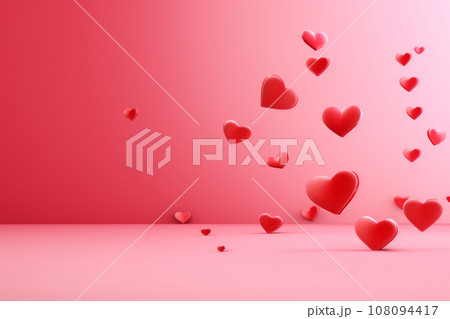 Red flying hearts on pink background. AI content.