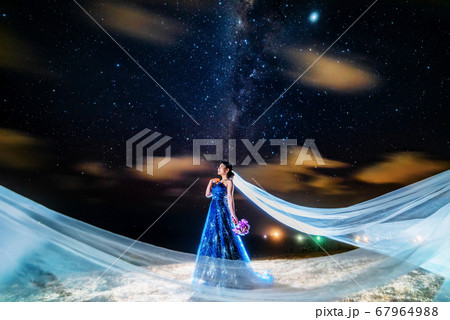 星空の下に立つウェディングドレスを着た女性
