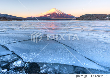 山梨県 冬の朝の結氷した山中湖と富士 2月