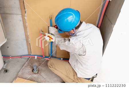 リフォーム工事 給水管・給湯管を取り付ける作業員