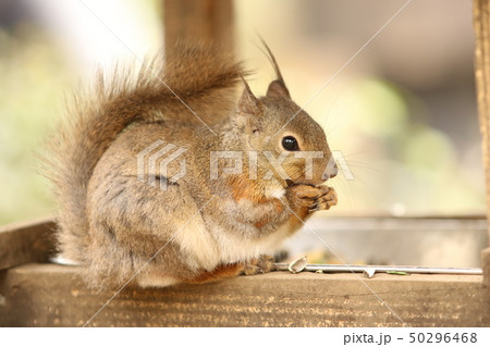 餌をかじるニホンリス 冬毛 しっぽ