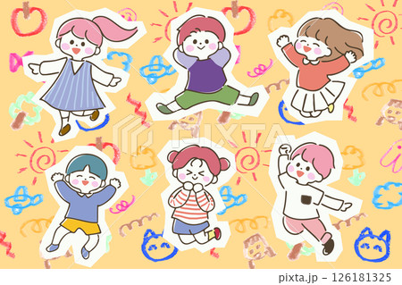 ジャンプする子どもたち ポップ 落書き風背景 横