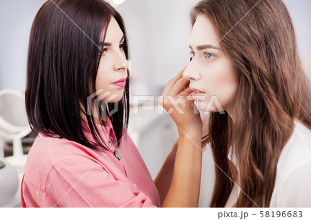 Makeup artist applies makeup to attractive blonde girl at the mirror with lamps in the beauty studio