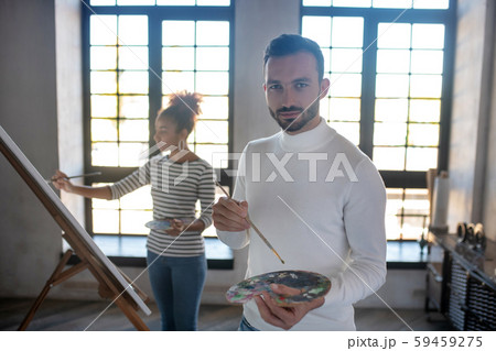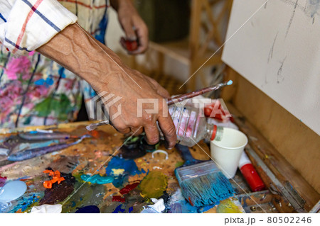 Creative pensive painter paints a colorful picture. Closeup of painting process in art workshop