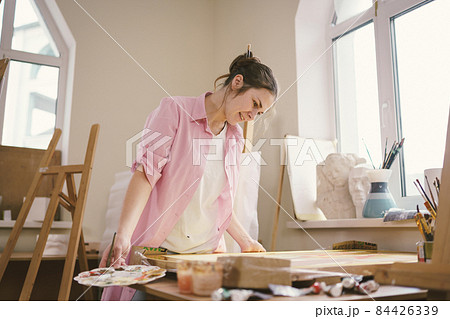 Caucasian woman artist working on a painting in bright daylight studio. Happy artist draws an art project with paints and a brush in the workshop. Hobby. Artist at work. Creative profession