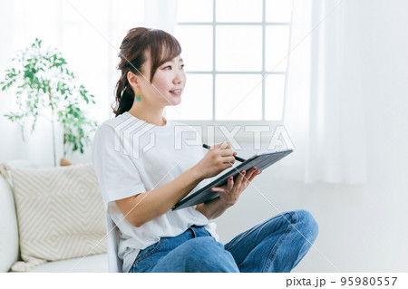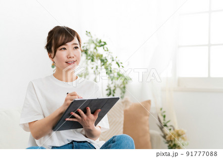 家でタブレットを使う女性(漫画家・お絵描き・小説家)