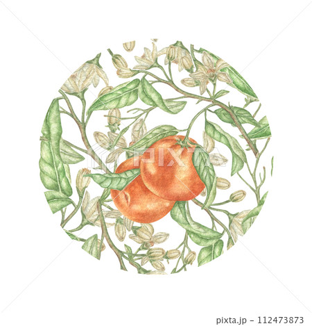 A watercolor circle with blooming orange branches and fruits. To decorate a round background, invitation, greeting card, poster, stickers, badges and more. Hand-painted. Isolated on a white background
