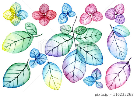 set of transparent hydrangea flowers and leaves. watercolor drawing with bright flowers and leaves