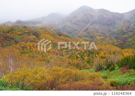 秋の栗駒山稜線から見る紅葉の山肌