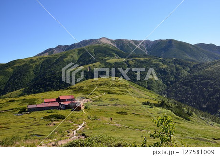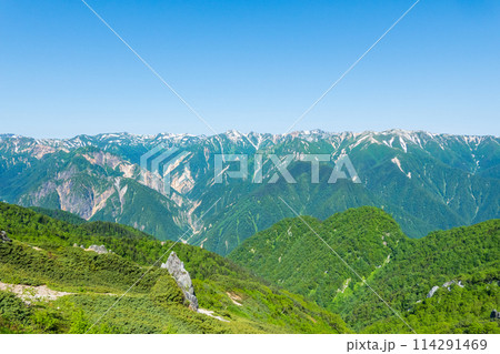 八ヶ岳連峰・硫黄岳稜線から見る赤岩ノ頭と残雪の槍・穂高連峰、乗鞍岳