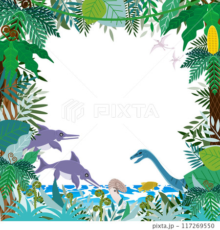 イクチオサウルスとプレシオサウルス 太古の植物とジュラ紀の海の恐竜などのフレーム(背景)