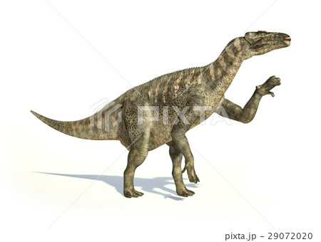 Iguanodon Dinosaur photorealistic representation, in dynamic posture.
