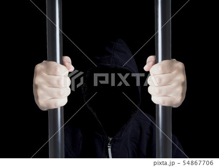 Anonymous criminal prisoner in hood holding prison