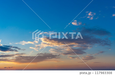 Beautiful dramatic scenic after sunset sky background after sunset, luxury soft gradient orange gold clouds and sunlight on the blue sky perfect for the background