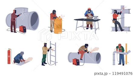 People weld metal. Welders work in protective masks and gloves, men repair, fixing and building, different pipes structures connection, cartoon flat style isolated nowaday vector set