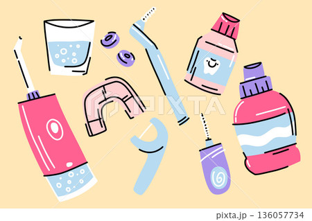 A large set for personal dental hygiene, electric and manual toothbrushes, dental floss, chewing gum