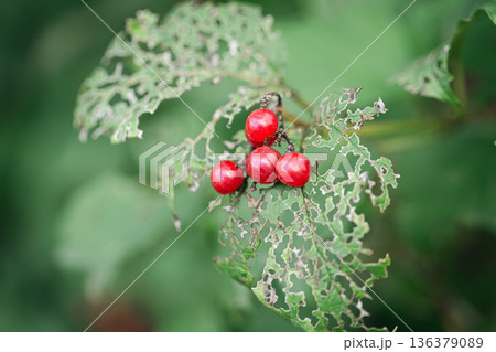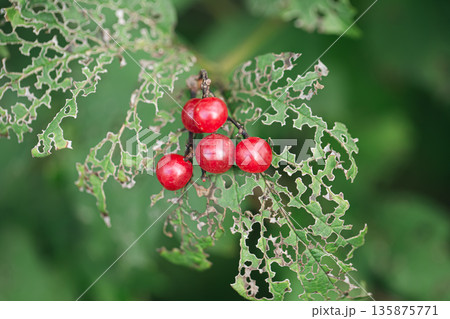 A holey leaf eaten by caterpillars, a leaf with a beautiful pattern.