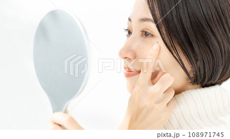 手鏡を見て黒子を気にする女性